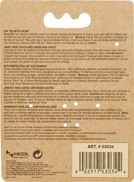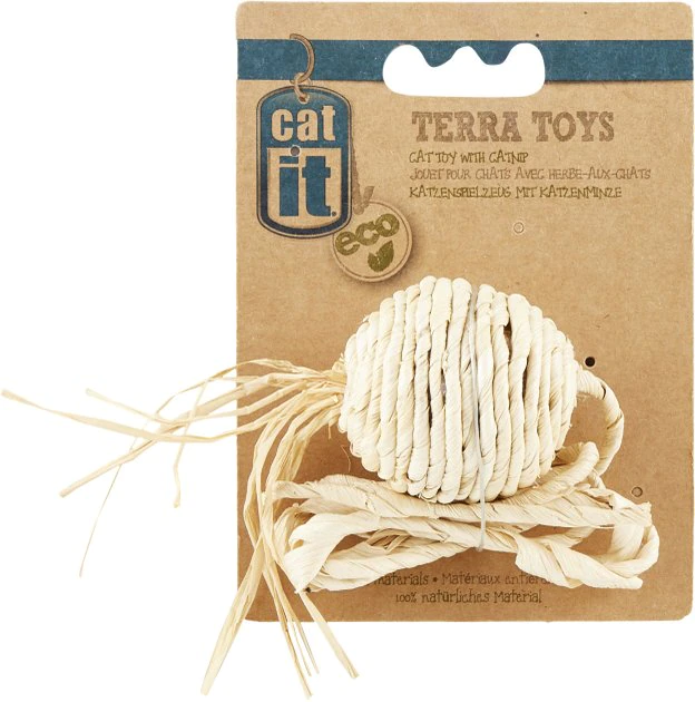 In feline mathematics, Ball plus String ALWAYS equals fun. Add a little catnip and the good times are really going! The Catit Cornhusk & Raffia Ball with String Cat Toy is an eco-friendly cat toy made from linen, raffia, and dried corn husk. It makes a crinkly noise that drives cats crazy every time they swat or pounce and comes with Catit’s catnip spray.