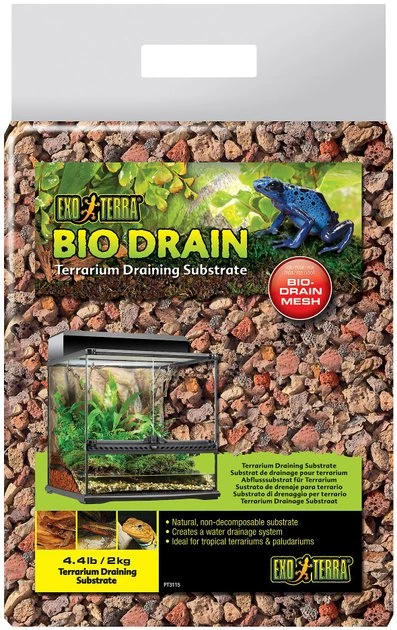 Create decorative water drainage systems without contamination from decorative substrate particles with the Exo Terra Bio Drain Terrarium Draining Reptile Substrate. The Exo Terra BioDrain Terrarium Draining Mesh is part of the BioDrain Terrarium Draining System. This non-toxic mesh keeps the underlying draining substrate separate from the decorative terrarium top-layer substrate which allows proper water drainage and prevents contamination. It is ideal for creating water areas and biological filtration systems. Exo Terra Terrarium Moss, Jungle Earth or Plantation Soil can be used as decorative substrates.