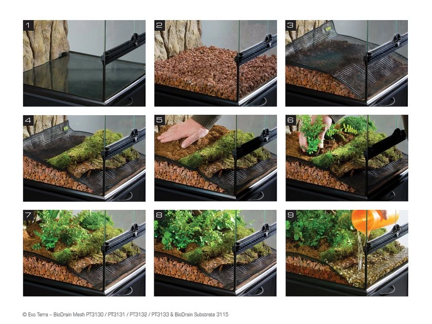 - Create a water part by removing substrate in the desired location, then cover the substrate entirely with the Bio Drain Terrarium Draining Mesh.