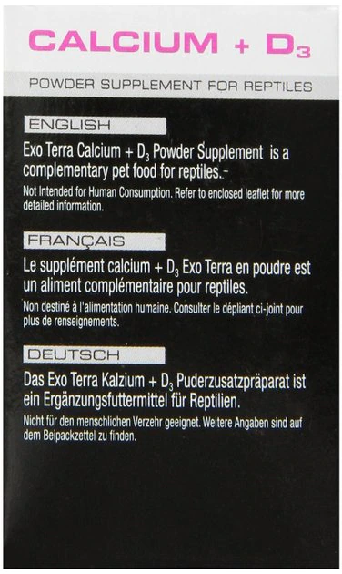 Feed your reptile proper levels of calcium to support bone health with Exo Terra Calcium + Vitamin D3 Powder Reptile Supplement. Calcium deficiency is a major dietary problem in captive reptiles. It can cause weak bones, muscle deficiency and metabolic bone disease. Exo Terra Calcium + D3 Powder Supplement contains high levels of phosphorus-free calcium as well as balanced amounts of vitamin D3 for optimal calcium absorption that is vital to reptiles not exposed to natural sunlight or ultraviolet light.
