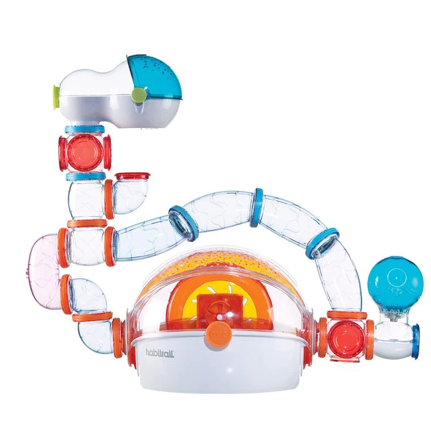 - Habitat includes: cage, mini maze with interactive chewable maze, water bottle, 2 tees, 3 elbows, 2 cubes, 4 curves, 1 U-turn, 7 windows and 15 lock connectors