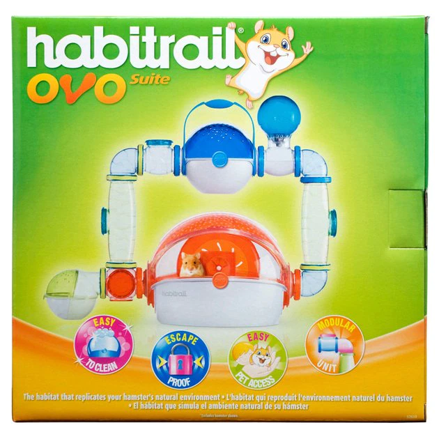 - Habit rail OVO Suite includes: main habitat, water bottle, food dish, exercise wheel, cozy hideaway den, transport unit, 2-10″ trails, 3 windows, 3 elbows, 1 tee, 1 cube and 11 lock connectors