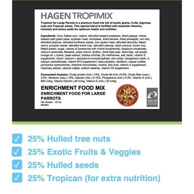 Keep your parrots healthy and fit with the nutrient-dense Tropimix Enrichment Large Parrot Bird Food. Not your ordinary bird mix, this 100% edible mix is packed with Tropican granules, peanut flavored sticks packed with nutrients and protein to support overall health and promote strong bones and vibrant feathers. Parrots love eating up the tasty hulled exotic grains, legumes, nuts and fruits, and there are zero hulls or shells which means less mess and clean-up. The formula provides plenty of different textures and flavors to help prevent birdie food boredom, and is also enhanced with essential vitamins, minerals and amino acids for beak to tail feather well-being.