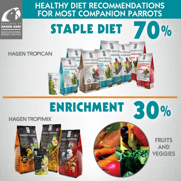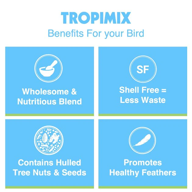 To keep your pet bird healthy, the water and seed cups should be cleaned daily and unsoiled Tropimix Food for Large Parrots should be replenished as needed. Monitor your pet bird for daily consumption of Tropimix.