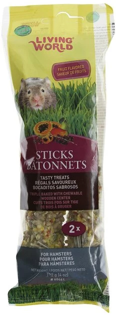 Living World Fruit Rabbit Stick Treats are healthy and delicious treats that provide great nutrition and a safe way to satisfy your pet’s instinctive need to nibble. These sticks contain high-quality grains, seeds and fruits, and are triple baked to ensure that your furry little friend gets a healthy, crunchy and irresistible treat. Highly palatable, Fruit Rabbit Stick Treats will entice your pet to chew away with enthusiasm. They provide an excellent form of exercise and entertainment as well as an effective outlet for your small animal’s constant need to gnaw. The sticks have natural wood centers that are completely chewable and safe. A flexible clip holder is included so you can easily hang them on the cage wire for easy access.