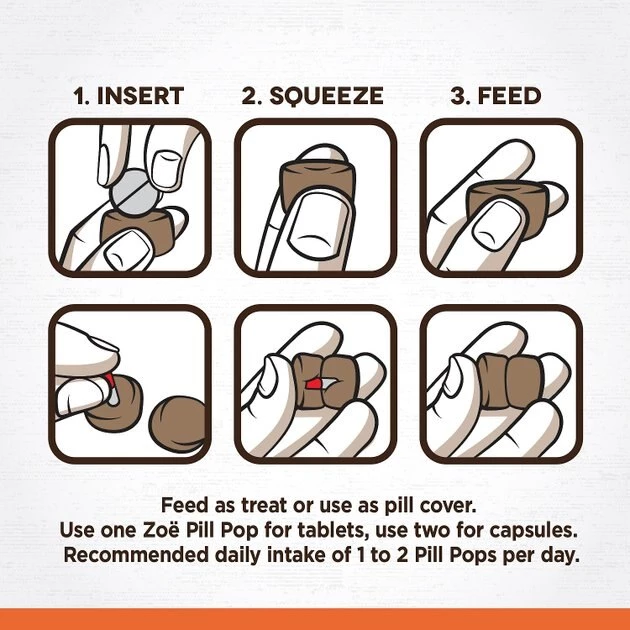 Feed as treat or use as pill cover. Use 1 Zoe Pill Pop for tablets, use 2 for capsules. Recommended daily intake of 1 – 2 Pill Pops per day.