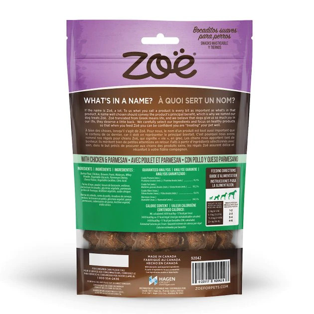 Zoe Tender Chunks Chicken & Parmesan Dog Treats are all-natural and designed with your pup in mind. These soft and chewy treats only contain 4 calories per bite and are made without corn, wheat, soy or artificial flavors or preservatives for a snack that really nurtures your dog. Developed in Canada from only North American ingredients, these chicken and Parmesan bites are bursting with wholesome flavor from ingredients you can trust. Plus, they’re the perfect size for training or rewarding your furry-friend to encourage good behavior without filling him up on unnecessary additives or preservatives.